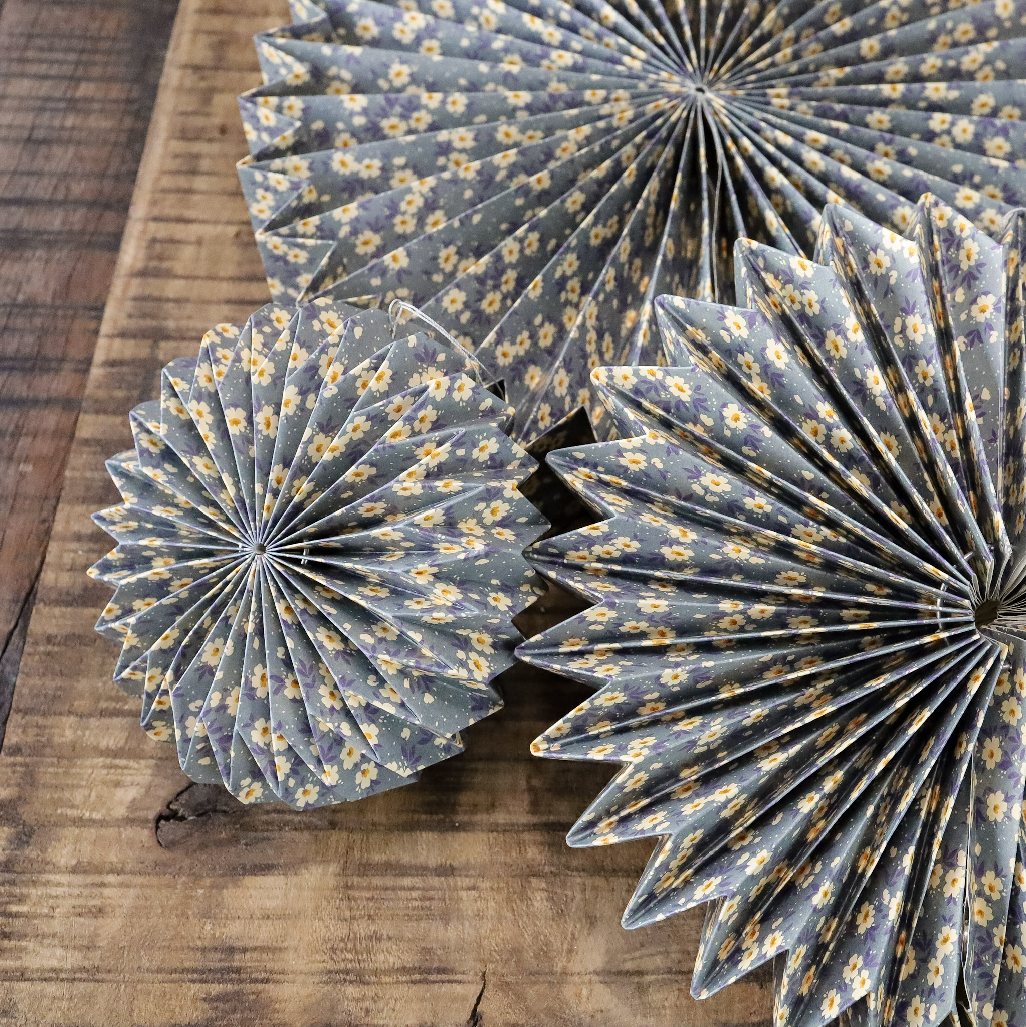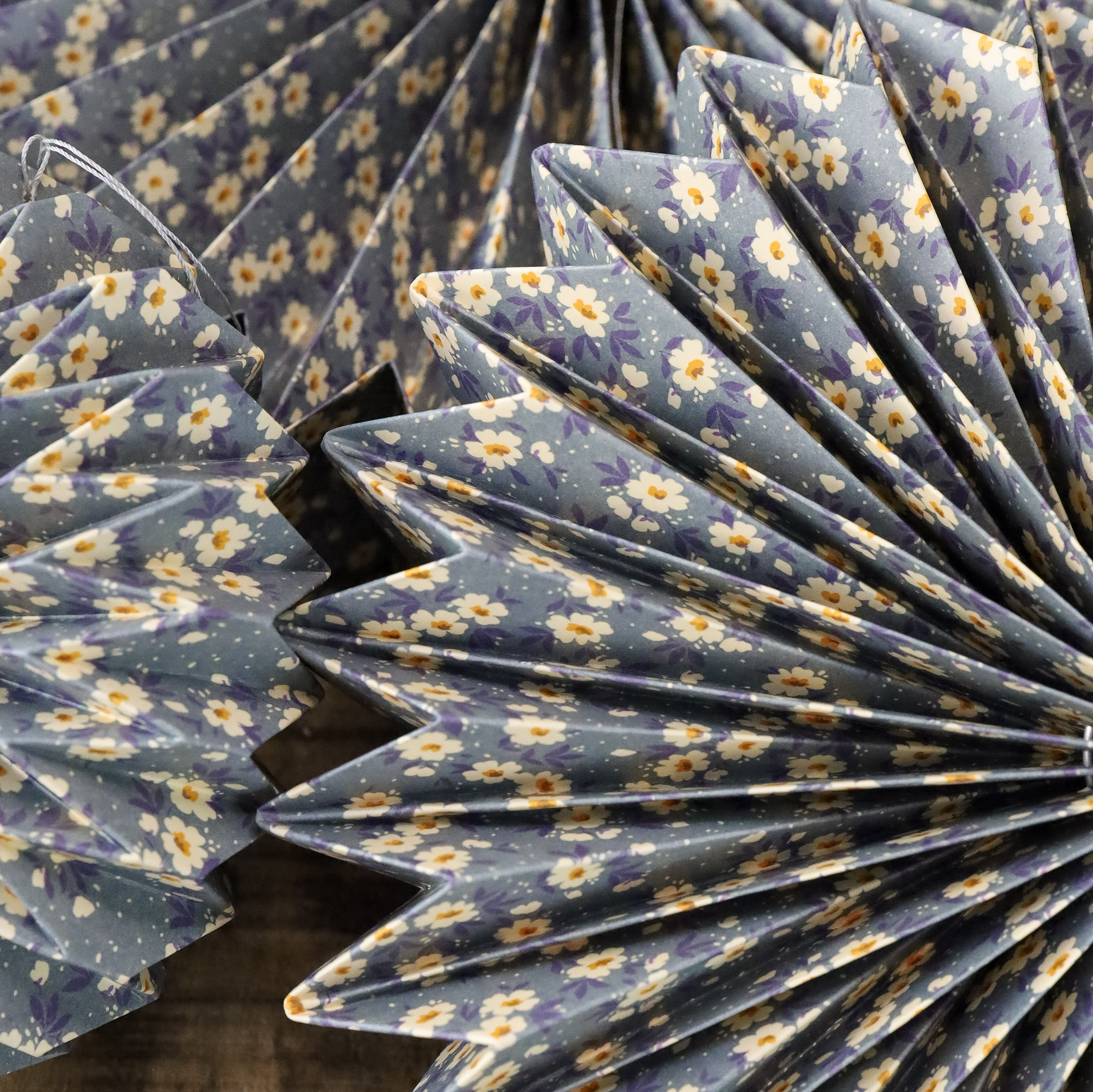 Diese liebevoll gefalteten Papierornamente aus blaufarbenen Papier mit feinem Blumenmuster sind ein echter Blickfang. Ob als Wanddeko, Tischschmuck oder als luftiger Hingucker am Fenster – die zarten Fächer bringen Stil und Nachhaltigkeit in dein Zuhause.